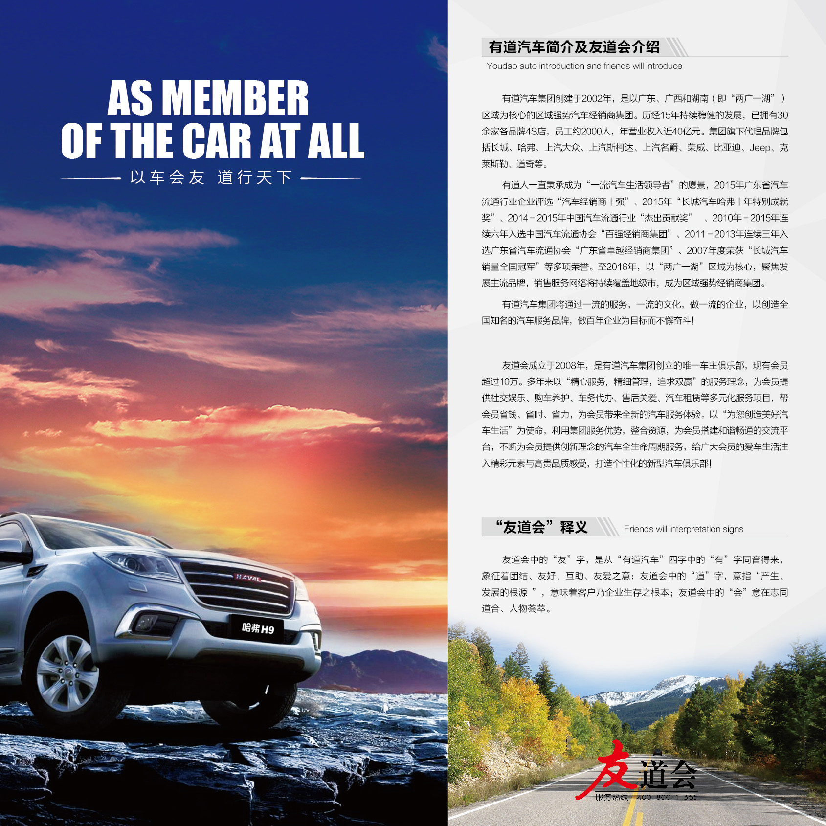 友道會成立于2008年,是有道汽車集團創(chuàng)立的唯一車主俱樂部,現有會員超過25萬。多年來以“精心服務, 精細管理,追求雙贏”的服務理念,為會員提供社交娛樂、購車養(yǎng)護、車務代辦、售后關愛、汽車租賃等多元化服務項目,幫會員省錢、省時、省力,為會員帶來全新的汽車服務體驗。以“為您創(chuàng)造美好汽車生活”為使命,利用集團服務優(yōu)勢,整合資源,為會員搭建和諧暢通的交流平臺,不斷為會員提供創(chuàng)新理念的汽車全生命周期服務,給廣大會員的愛車生活注入精彩元素與高貴品質感受,打造個性化的新型汽車俱樂部!