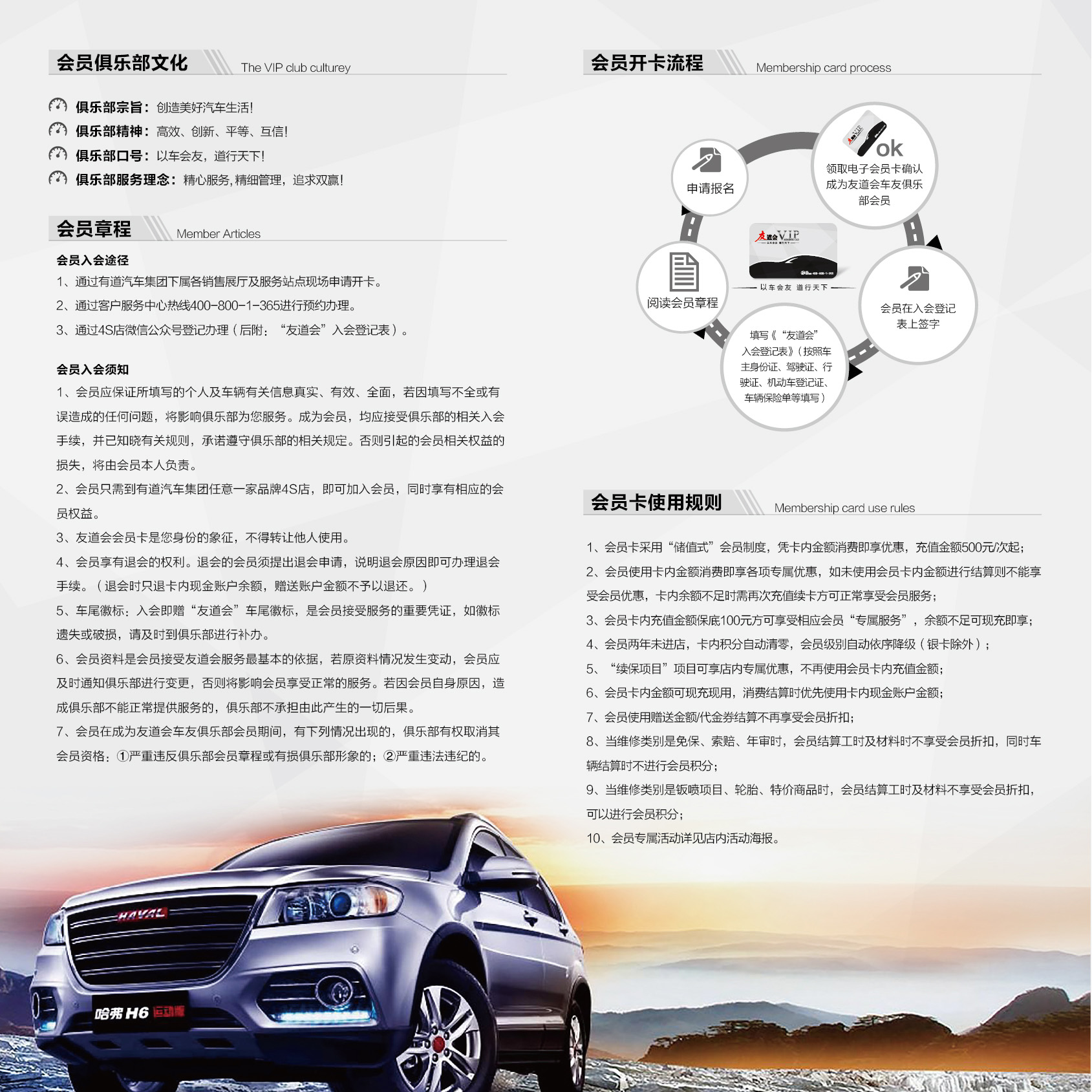 5.車尾徽標:入會即贈“友道會”車尾徽標,是會員接受服務的重要憑證,如徽標遺失或破損,請及時到俱樂部進行補辦。