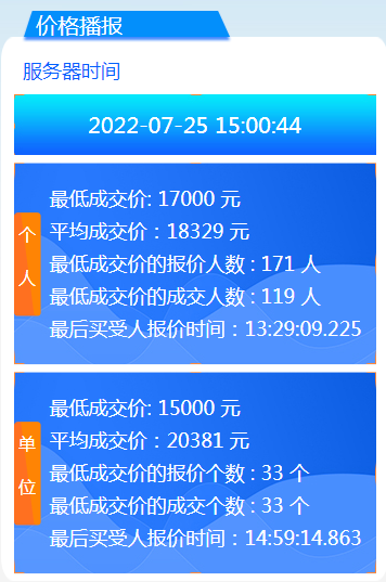 單位最低成交價(jià)為15000元,最低成交價(jià)成交個(gè)數(shù)為33個(gè),單位平均價(jià)格為20381元/人!